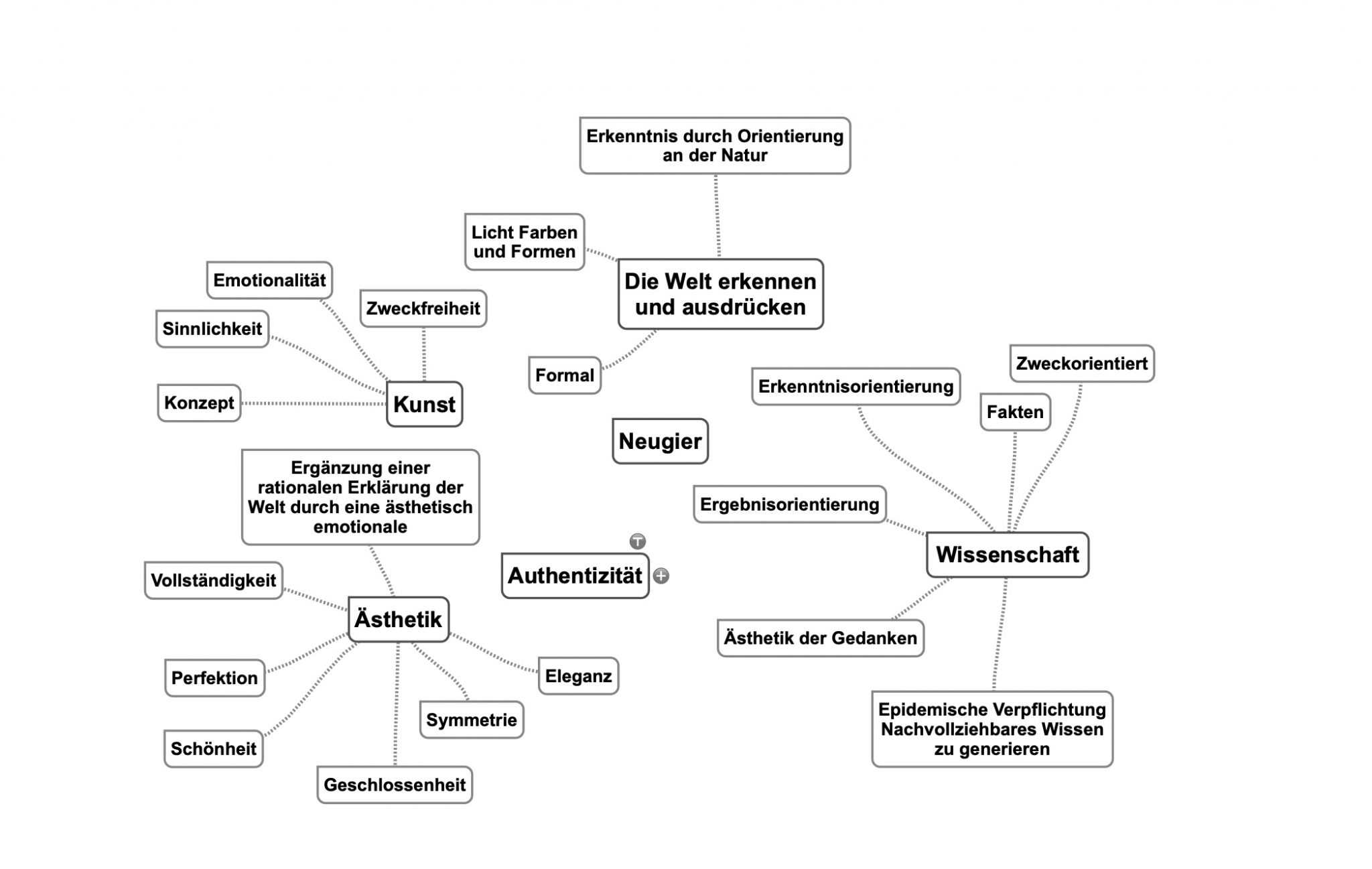 This mind map was based on interviews with scientists. Among other things, we asked about the drive, to work scientifically or to decide on a way of life as a scientist. We compared their answers with the answers we gave ourselves as artists. We then filtered essential nouns and core phrases out of the interview and grouped them together. The task was to produce as many unique references as possible. We worked on it until only a few elements without reference remained in the room. There were terms left that could not be clearly assigned or even, as in the case of aesthetics, formed their own cloud of related terms. We can identify these terms as an intersection between the drive of artistic and scientific work.