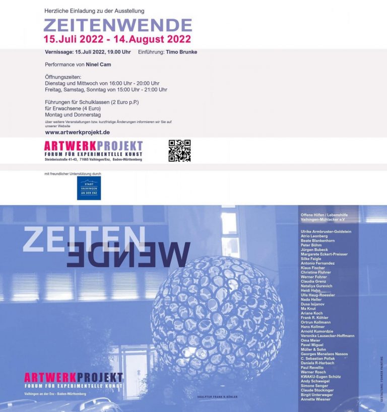 July 15, 2022 – August 15, 2022 ARTWERK PROJECTAddress: Steinbeisstraße 41-43, 71665 Vaihingen / Enz Please pay attention to the changed opening hours: Saturday, Sunday from 15:00 – 20:00.On weekdays visit of the exhibition possible by prior arrangement with Claudia Grenz +49 179 4572115 Vernissage: Friday the 15.July 19.00 clock Müller & Sohn artprojects is represented…